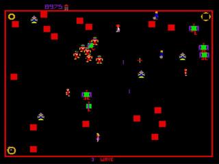 With the plot set, the next thing to get your head around playing this game is the dual-joystick control system. The left-hand joystick provides maneuverability (usual eight directions) to evade the robots and also rescue the humans. The right-hand joystick is used to fire the laser gun (also in eight directions) to disintegrate the robots in each wave (level). Once you get the hang of the control system, you will be blasting Grunts, Tanks, Brains and rescuing the hapless humans in no time.