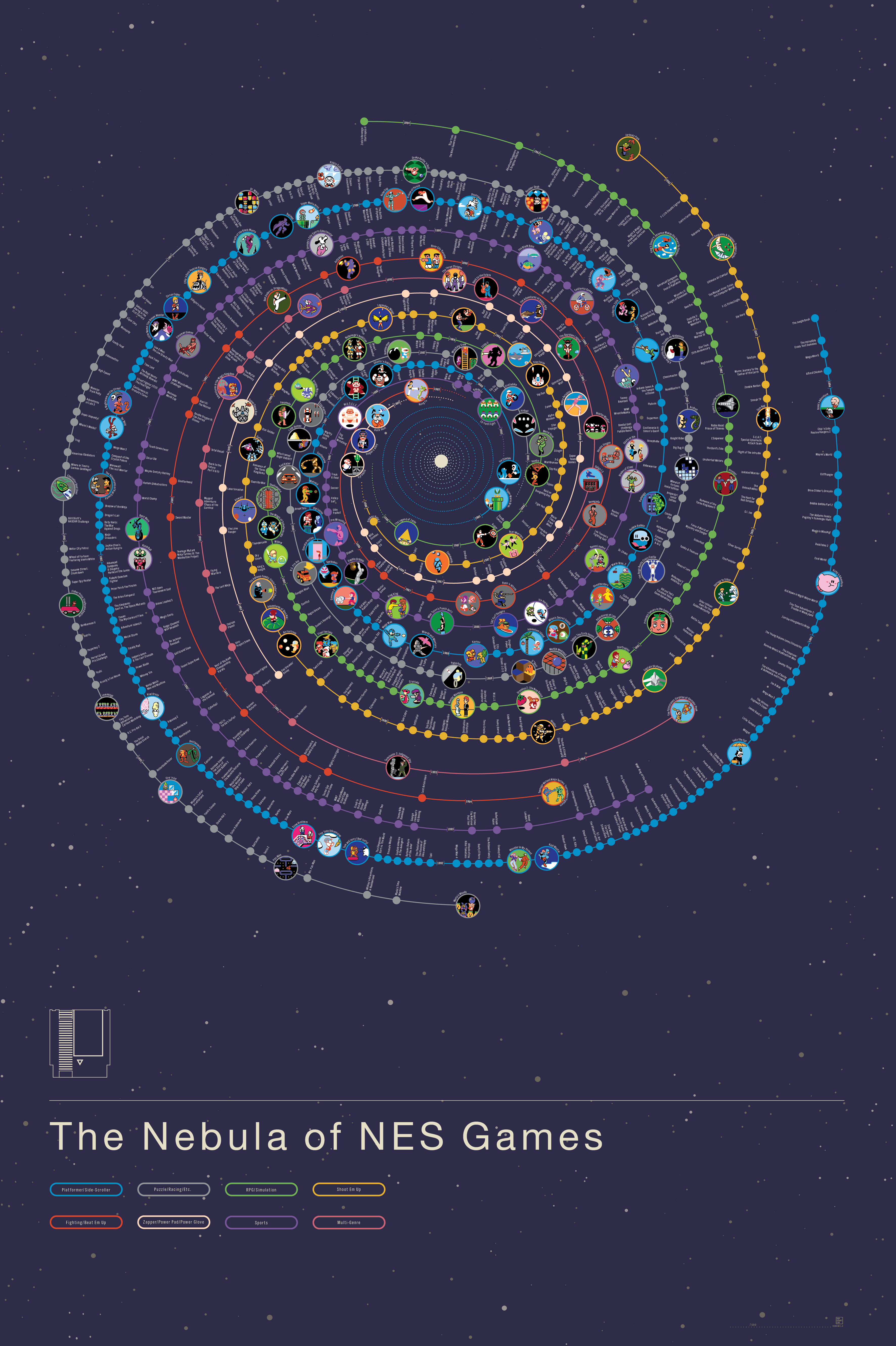 All I can say is, this Pop Chart Lab creation is extremely cool: astronomy mixed with NES (Nintendo Entertainment System) games goodness. Does this look like a nebula or our very own Milky Way galaxy strewn with Nintendo games?
